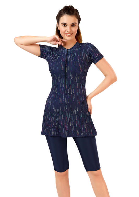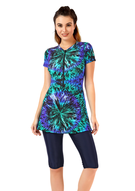 Melody : Swim dress with zipper , sleeves and printed patchwork on the sides
